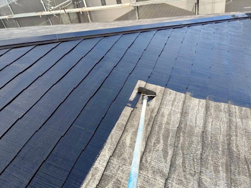 本日は前回に続き屋根塗装の下塗り・中塗り作業を行っています。