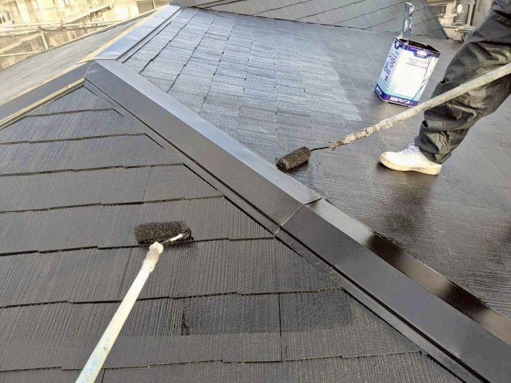 本日は屋根塗装の上塗り作業を実施し、これまでの下塗り・中塗り工程を踏まえ、仕上げの上塗りを行うことで、屋根全体をしっかりと仕上げています。